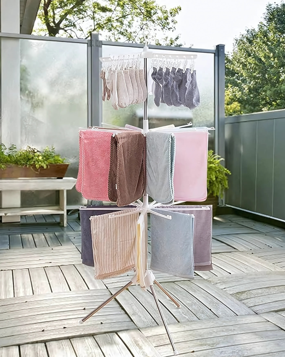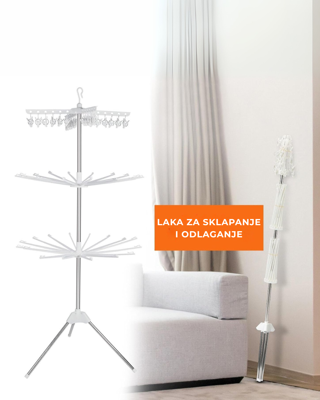 🔹 Praktična, stabilna i sklopiva sušilica za veš dizajnirana da uštedi prostor i pruži maksimalnu efikasnost u sušenju odeće. Sa svojom rotirajućom funkcijom od 360°, omogućava jednostavan pristup i optimalno sušenje svih vrsta garderobe.